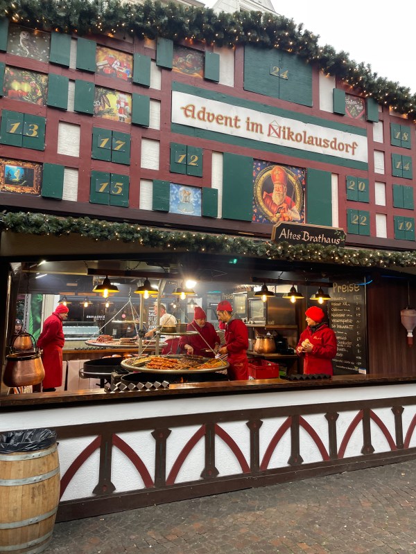 Nikolausdorf (Nicholas Village) market was where our group enjoyed the food most. Can you say swinging sausages? I also loved the advent calendar above the sausage booth.
