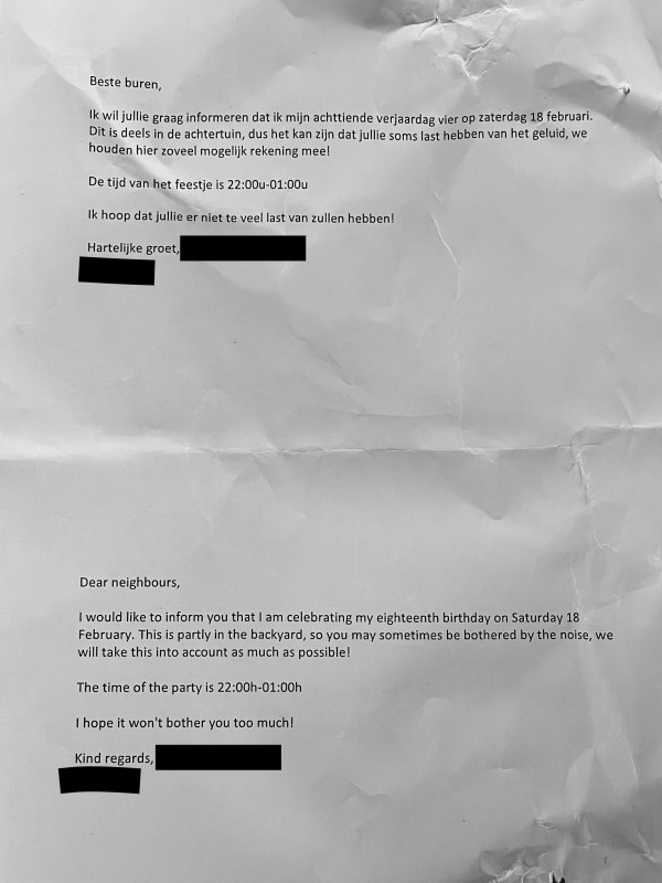 Today we received our second letter from a neighbor letting us know about their upcoming party and apologizing in advance for any noise. They know their audience, writing in both Dutch and English. The drinking age here is 18 years old, so you can imagine that this is likely to be a “fun” party.