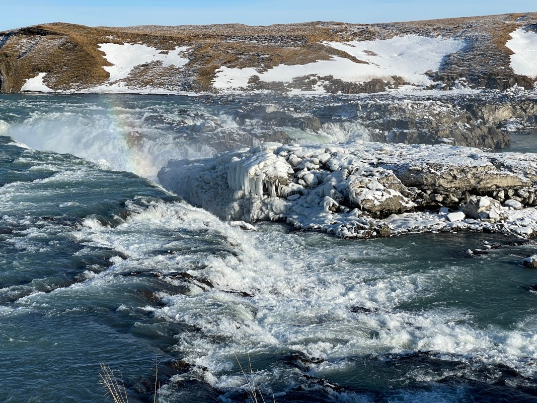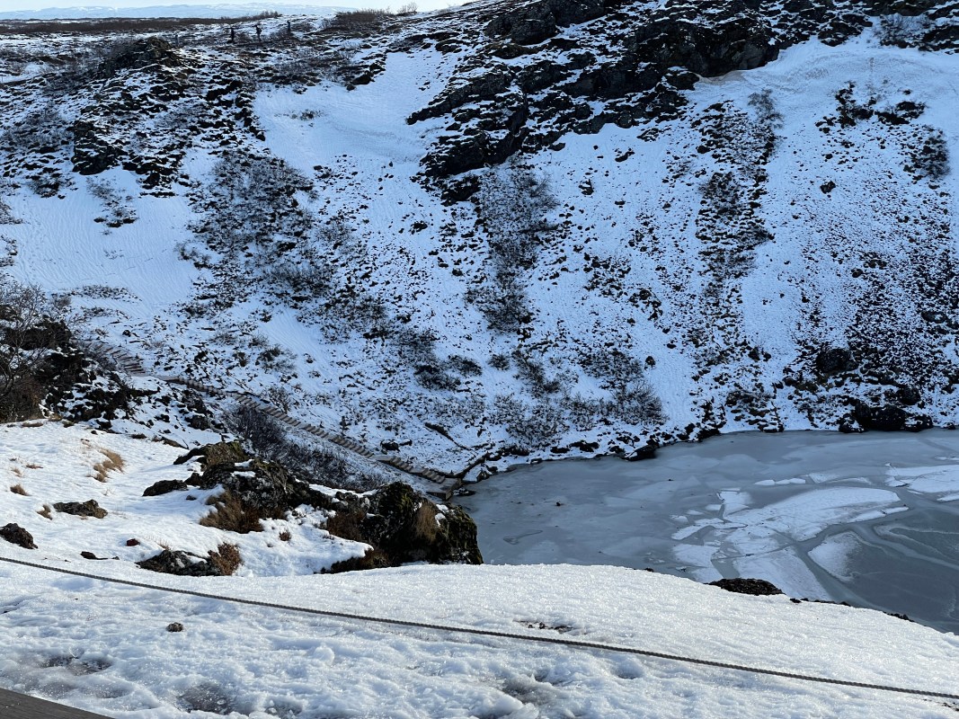 To see what a volcano looks like from the top we headed to the Kerið Crater. This volcanic caldera is 55 m deep and 270 m in diameter, about 3000 years old. In summer, or when not covered in snow, you can see the red volcanic rocks and the water below (photo below left). Unfortunately from my photo (below right) it isn’t quite as captivating in winter. Unlike most other outdoor sights, there is a small entrance fee.