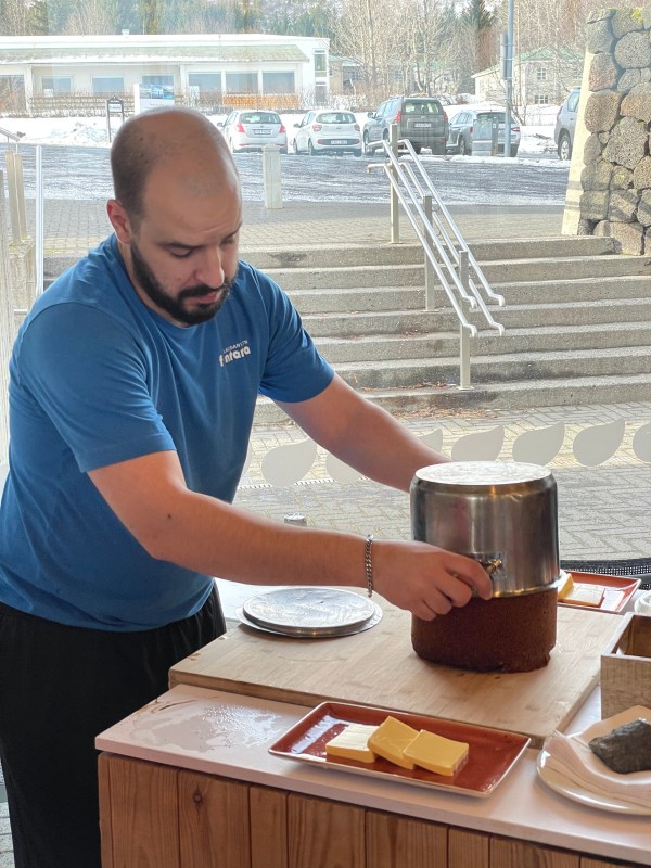 They offer two tours a day (three in the summer), but you need to prebook. You will see them dig up a pot of rye bread and place another in its place to be collected in 24 hours. The hot moist sand is heated by geothermal springs. It is quite something. Afterwards you get to sample the bread along with Icelandic butter and fish from a neighboring lake.