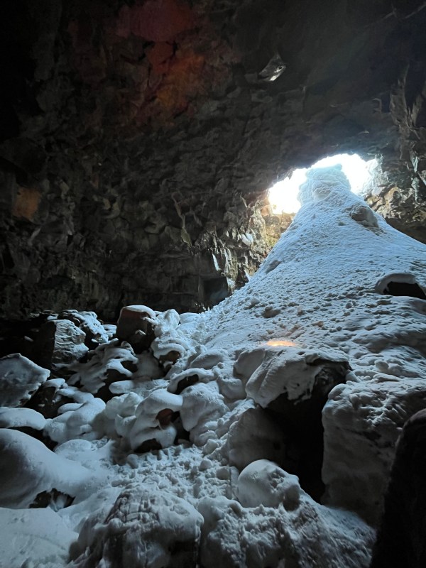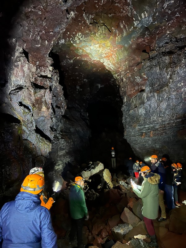 Rather than take the 5-6 hour round trip hike to see the Fagradalsfjall volcano, we opted to visit the Raufarhólshellir lava tunnel. This one hour tour takes you through a lava tube formed about 5200 years ago during the Leitahraun eruption. You done crampons and helmet with headlamp and head into the tunnel and along a 1 km path.