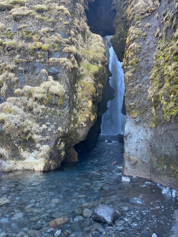 Seljalandsfoss it a towering wall of water, what you usually think of when you think of impressive waterfalls. But if you walk about 500 m to the left, down the marked path, you will come across the stunning Gljúfrabúi, which is also known as the hidden waterfall. The middle picture above shows what it looks like from the outside. You can see the stream of water, but it feels like more of a glimpse. If you are willing to get wet you can climb through the opening, and you get the view on the right, complete with an amazing photo opportunity.